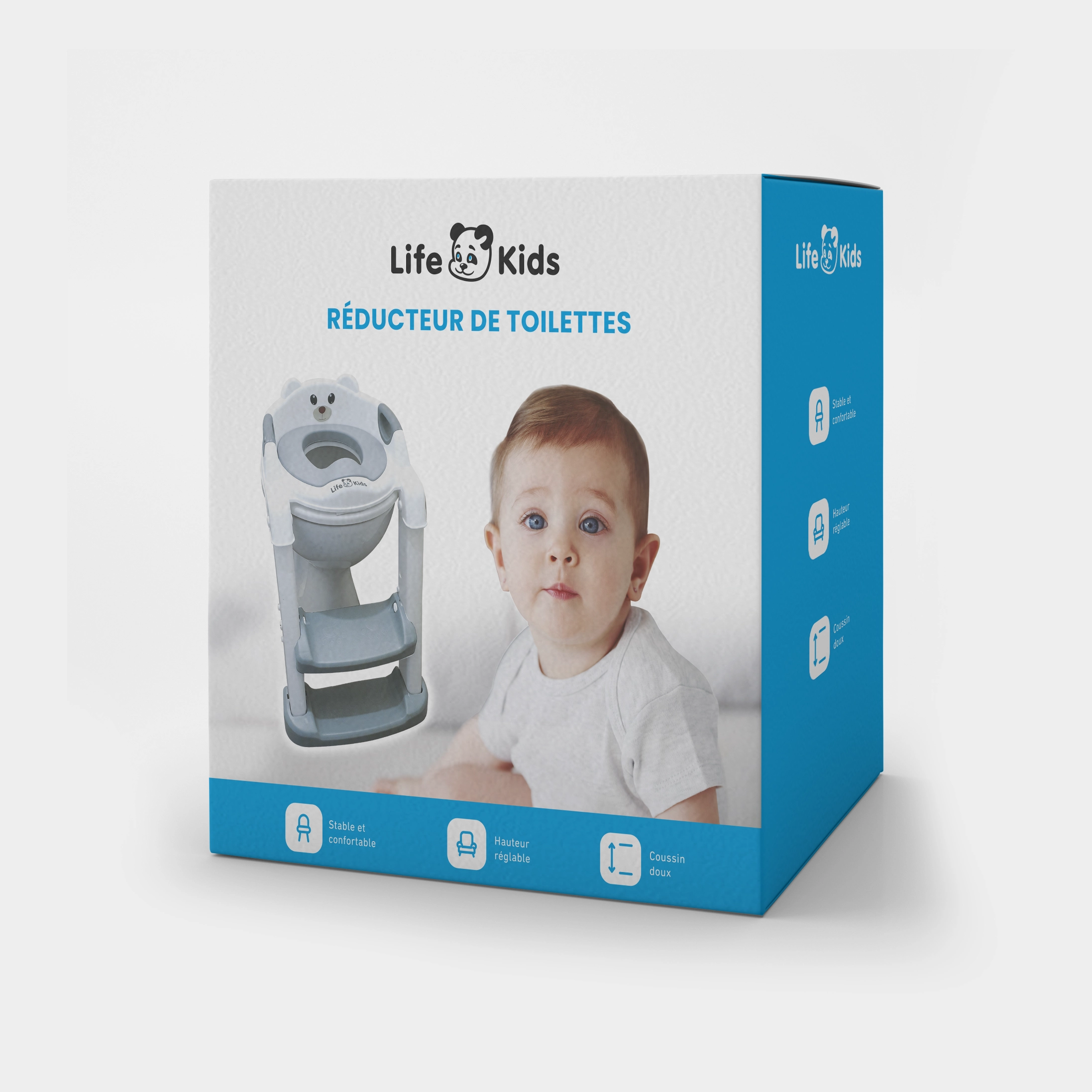 Diseño de packaging para el reductor de toilettes Life Kids, enfocado en transmitir seguridad, suavidad y facilidad de uso.